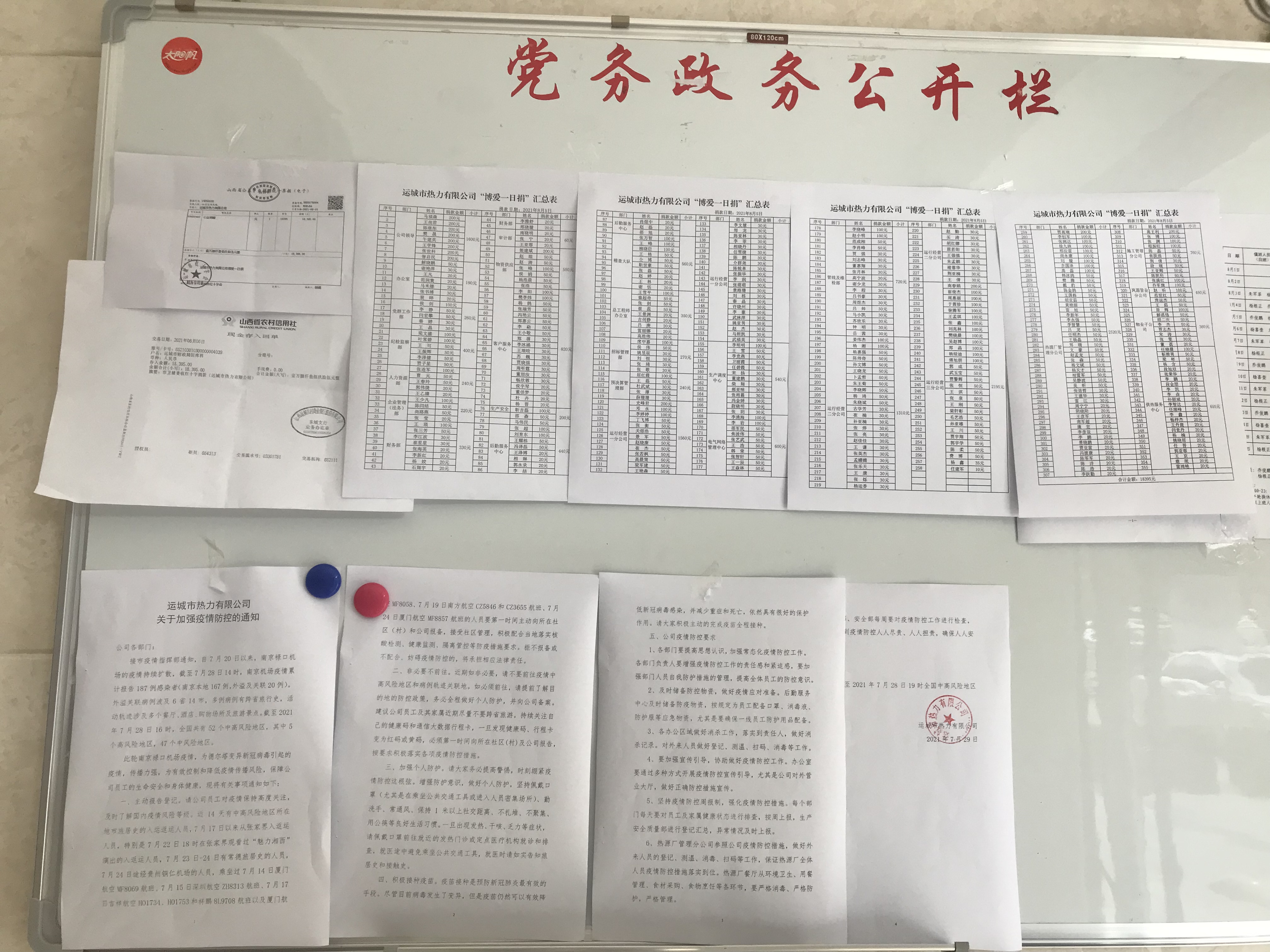 活動(dòng)中,公司領(lǐng)導班子率先垂范,廣大黨員干部紛紛慷慨解囊,踴躍捐款,積極奉獻自己的一份愛(ài)心。公司355名黨員干部職工共計捐款18395元,以實(shí)際行動(dòng)展示了熱力職工團結互助、扶危濟困、助人為樂(lè )的社會(huì )責任擔當,此次所捐款項已全部交至運城市紅十字會(huì )。